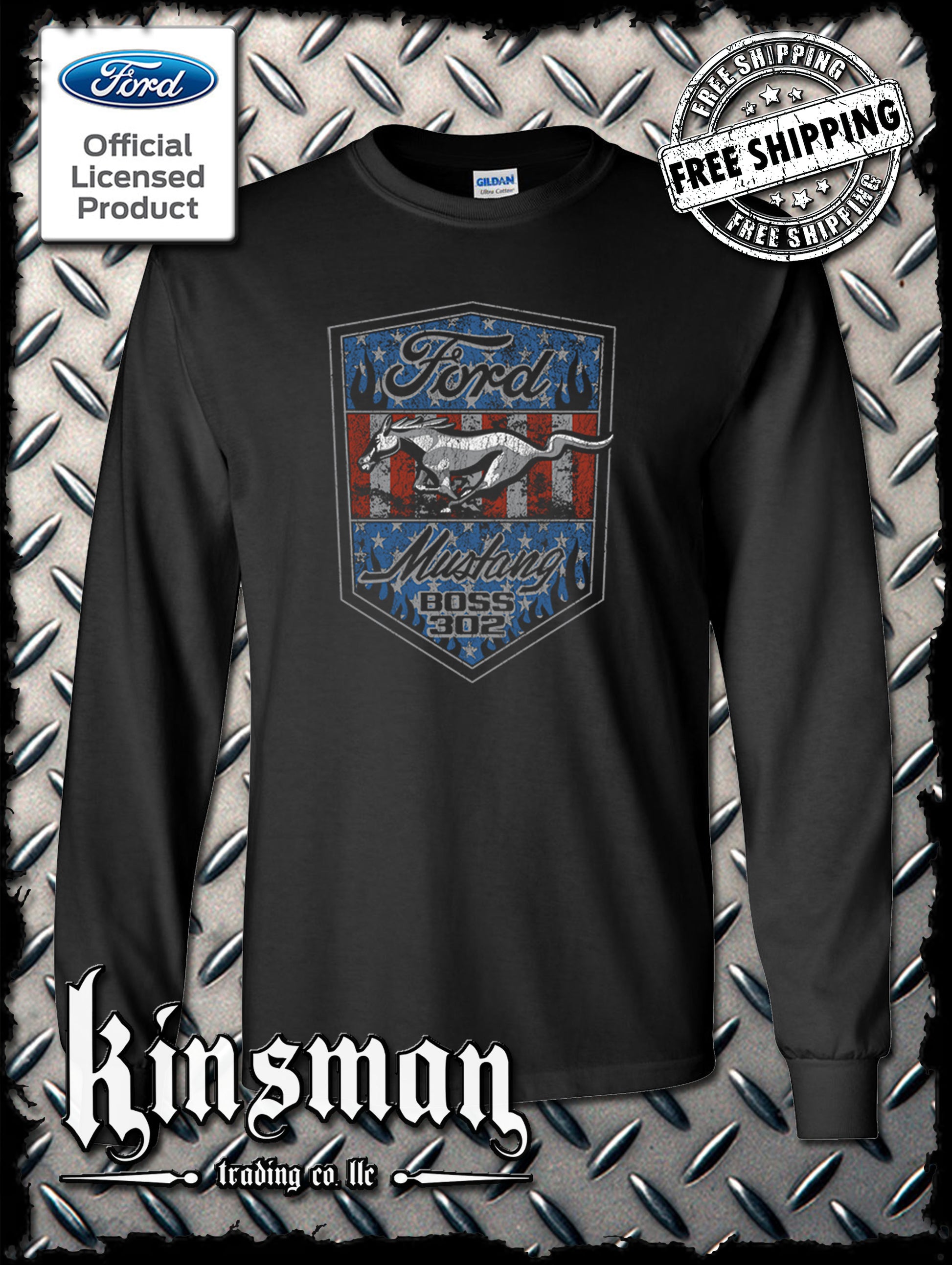 Ford Mustang Shield US Flag Long Sleeve T-Shirt - Boss 302 Official Licensed Product